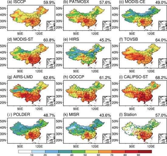 The remarkable differences in the cloud amounts over China can be attributed to the different sensitivities of the observational instruments to thin clouds (e.g., cirrus) and classification algorithms for each cloud type. The partitioning of the individual contributions from these two factors to the uncertainty associated with cloud detection needs to be further investigated in the future.