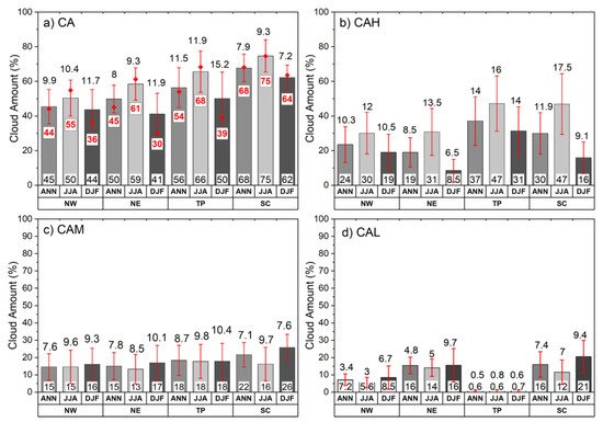 The annual average (ANN), summer (JJA) and winter (DJF) TCA of satellite cloud products in different regions of China and the mean and standard deviation of the cloud amount of high-, mid- and low-level clouds, unit: %. (a) CA: total cloud amount, (b) CAH: high-level cloud amount, (c) CAM: mid-level cloud amount, (d) CAL: low-level cloud amount, where CAH + CAM + CAL = CA. Red line segments represent standard deviations across all satellite datasets, and the numbers shown at the bottom of the histogram represent the mean of all satellite datasets; red triangles represent site-observed values.