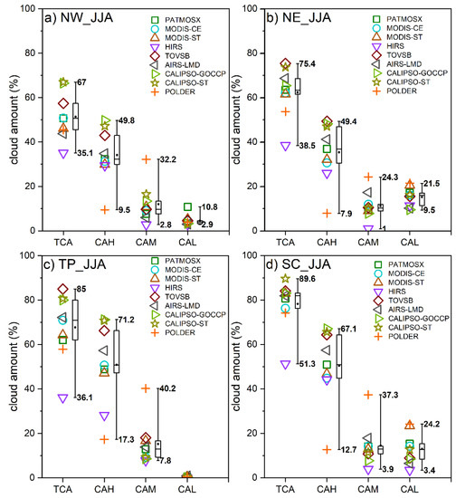 Averaged summer total cloud amount (TCA), high-level cloud amount (CAH), mid-level cloud amount (CAM), and low-level cloud amount (CAL) at 13:30 local time across different satellite datasets over four subregions of China: (a) NW region; (b) NE region; (c) TP region; and (d) SC region (unit: %), with symbols marked for different datasets. The box–whisker plot shows the maximum, minimum, upper quartile, lower quartile, and median for all datasets, and the black dots represent the algorithm mean. The specific values of the maximum and minimum values are also marked on the box–whisker plot.
