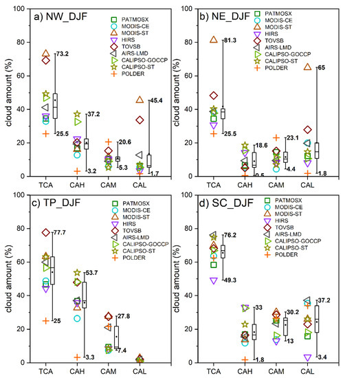 Averaged winter total cloud amount (TCA), high-level cloud amount (CAH), mid-level cloud amount (CAM), and low-level cloud amount (CAL) at 13:30 local time across different satellite datasets over four subregions of China: (a) NW region; (b) NE region; (c) TP region; and (d) SC region (unit: %), with symbols marked for different datasets. The box–whisker plot shows the maximum, minimum, upper quartile, lower quartile, and median for all datasets, and the black dots represent the algorithm mean. The specific values of the maximum and minimum values are also marked on the box–whisker plot.