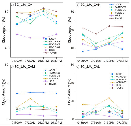 (a) Total cloud amount (CA), (b) high-level cloud amount (CAH), (c) mid-level cloud amount (CAM), and (d) low-level cloud amount (CAL) retrieved at four observation times for six satellite datasets in summer over south China, unit: %. The observation times of PATMOSX, MODIS-CE, MODIS-ST, HIRS, and TOVSB are 01:30, 07:30, 13:30, and 19:30 local time, and the observation times of ISCCP are 03:00, 09:00, 15:00, and 21:00 local time.