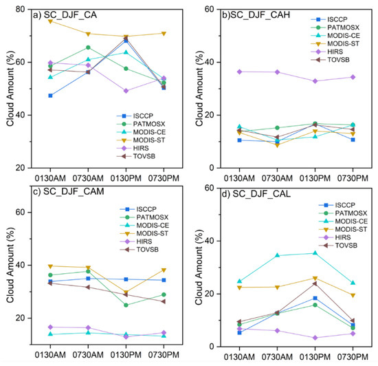 (a) Total cloud amount (CA), (b) high-level cloud amount (CAH), (c) mid-level cloud amount (CAM), and (d) low-level cloud amount (CAL) retrieved at four observation times for six satellite datasets in winter over south China, unit: %. The observation times of PATMOSX, MODIS-CE, MODIS-ST, HIRS, and TOVSB are 01:30, 07:30, 13:30, and 19:30 local time, and the observation times of ISCCP are 03:00, 09:00, 15:00, and 21:00 local time.