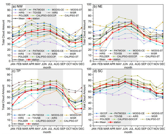 For the seasonal variations, most cloud products show similar features, with the largest cloud amount in summer and smallest in fall and winter. The standard deviations of the monthly cloud amount are the largest on the TP, ranging from 10.6% in October to 16% in February and March, and they are the smallest in SC, with standard deviations generally less than 8.8%. Furthermore, different seasonal cycles are found in two datasets (MODIS-ST and HIRS) over the northern part of China (NW and NE), where the largest cloud amount is found in winter and the smallest is found in September and October. In addition, in the TP region, HIRS tends to provide a seasonal cycle that is the opposite of the other datasets.