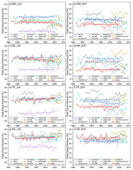 Interannual variation characteristics of the TCA in summer and winter in the different regions of China. (a,b) NW region; (c,d) NE region; (e,f) TP region; and (g,h) SC region. The red pentagram (red lines) represents site observations, and the other colored symbols represent results from different satellite datasets. The bold lines denote the linear regressions for the three satellites (HIRS, ISCCP, PATMOSTX) with more than 20-year observations available and for the station observation.