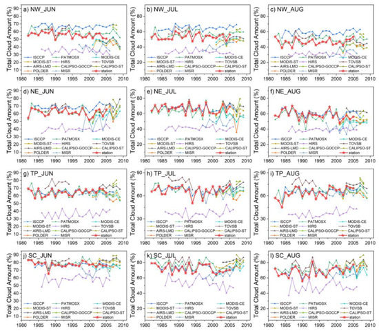 Temporal variations of TCA averaged over four regions of China in June, July, and August. (a–c) NW region; (d–f) NE region; (g–i) TP region; and (j–l) SC region. The red pentagram (red lines) represents site observations, and the other colored symbols represent results from different satellite datasets.