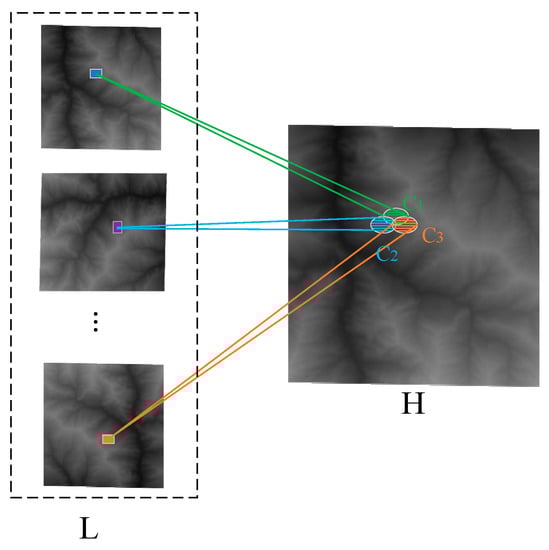 The DEM is represented by various types of grids, whose plane coordinates and heights are used as the position and greyscale values of the image pixels, respectively. The image responds to the image features by the greyscale values, so the surface topographic features can be reflected by the height of the elevation values of each grid. In addition, the topographic features represent the terrain pattern [], which has a large amount of internal repetitive information, and internal repetitive information usually provides stronger predictive power than external statistics obtained from the dataset. Therefore, an internal learning approach was used to perform super-resolution reconstruction of the DEM, as shown in Figure 1. There are multiple similar image blocks inside the low-resolution DEM , where , are within the low-resolution DEM, can be seen as multiple constraints of the low-resolution DEM on the high-resolution DEM []. The internal learning methods learn specific surface topographic morphological features through these repeated patches, mining potential distribution relationships between surface elevation values. Therefore, the internal-learning-based DEM super-resolution reconstruction method takes advantage of the property that the DEM keeps repeating itself at the same or different scales. Therefore, the a priori information of the DEM learned through the internal learning method contains a larger weighting of the detailed features of the DEM, which in turn ignores the information related to the global features of the DEM.