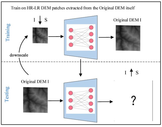 Deep learning [] abstractly learns high-level features of data and their internal potential distribution patterns through various types of neural networks using multilayer non-linear transformations. Accurate a priori information is provided for the solution of the ill-posed inverse problem of super-resolution reconstruction []. Similar to interpolation methods, deep learning-based DEM super-resolution reconstruction algorithms learn from a large amount of DEM sample data, reconstruct the low-resolution DEM, construct a data mapping between the low-resolution DEM and the high-resolution DEM, and obtain a high-resolution DEM that matches the real terrain [,,]. Depending on the training data, it can be divided into two types: external learning and internal learning. Both methods are limited by the spatial resolution of the original input DEM [] but external learning learns the mapping function between low-resolution DEMs and high-resolution DEMs through the DEM dataset, whereas internal learning uses similarity within the image to build its feature mapping.