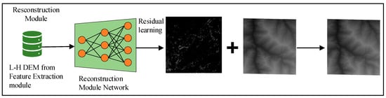 To learn the detailed features of the DEM in the feature extraction module, the initial estimated high-resolution DEM learned by the feature extraction module is used to construct the DEM external dataset. The learning of the external prior is then performed by the reconstruction module to obtain the external prior of the DEM from the low-resolution DEM. The processing flow of the reconstruction module is shown in Figure 3.