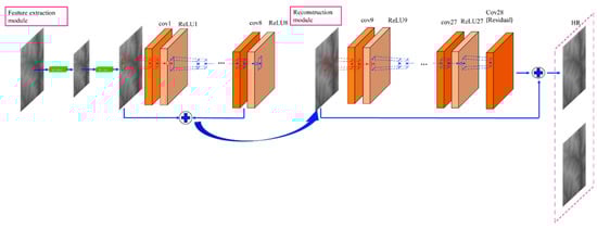 In practice, however, is a singular matrix, so there are multiple solutions to . The high-resolution solution process is therefore usually regarded as the solution of an ill-posed inverse problem. Usually, the solution of an ill-posed inverse problem is converted to a well-conditioned problem by increasing the number of constraints [,]. The deep-learning-based super-resolution reconstruction algorithm constrains by attaching different prior information; therefore, it is full rank and thus solves for . Different methods attach different constraining information to the network, which in turn leads to different weighting factors for the parameters of the network training corresponding to different features.