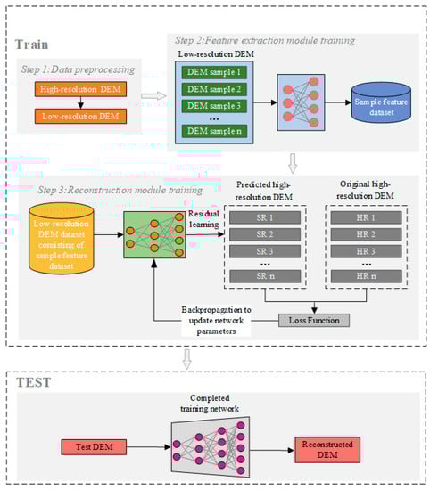 The entire algorithm process can be described as follows. In the training stage, firstly, the original high-resolution DEM is preprocessed to obtain a low-resolution DEM, and the low-resolution DEM is obtained from the original high-resolution DEM using the Bicubic method. Then, the low-resolution DEM samples are input to the feature extraction module separately to obtain the sample feature dataset. Finally, the low-resolution DEM dataset constructed from the sample feature dataset is input to the reconstruction module to train the network parameters. Network learning uses residual learning to avoid the problem of model degradation brought about by the deepening of the network. In addition, the network parameters are updated by solving the loss function between the predicted high-resolution DEM and the real high-resolution DEM to make the model training optimal. In the testing stage, the test data are input to the trained network for direct super-resolution reconstruction of the DEM. Finally, the elevation values in the output data are extracted, and the output results are validated for analysis. The whole network process is shown in Figure 6.