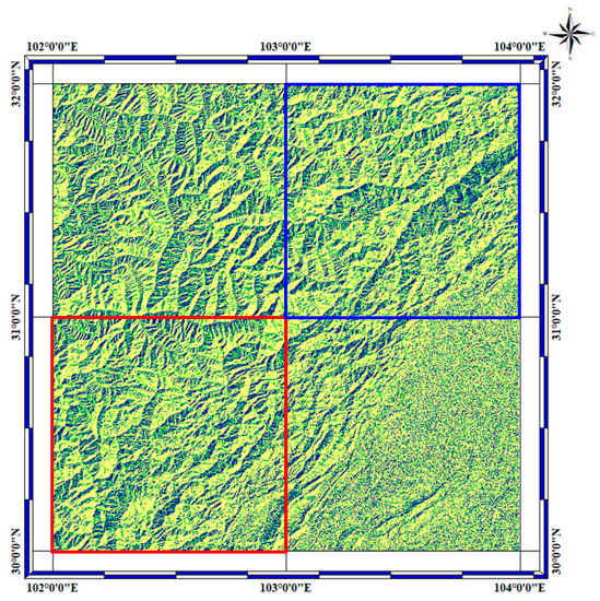 To verify the effectiveness of the model for super-resolution reconstruction of the DEM and the model generalization capability of our proposed combined internal and external learning DEM super-resolution reconstruction algorithm, we select two separate test datasets. We divide the 31°N–32°N, 103°E–104°E region into 144 300 × 300 DEM patches, and we select 120 DEM patches containing both flat areas and mountainous areas for training the network model and another 24 DEM patches as a test dataset within the training area to validate the model’s effect on the super-resolution reconstruction of the DEM. The region in the blue box shown in Figure 7 contains 122 small DEM patches of the training set and 24 DEM patches of the test set of the training area. In addition, the 30°N–31°N, 102°E–103°E region was similarly divided into 144 sheets and Block size of 300 × 300 each to construct a DEM test dataset outside the training area to verify the generalization ability of the model. The region within the red box plot shown in Figure 7 contains 144 DEM patches from the test set outside the training area.