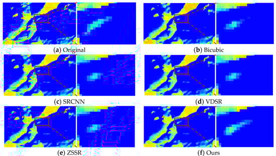 Comparison of the results of the original high-resolution DEM with the five DEM super-resolution reconstruction methods: (a) Original, (b) Bicubic, (c) SRCNN, (d) VDSR, (e) ZSSR, (f) Ours.
