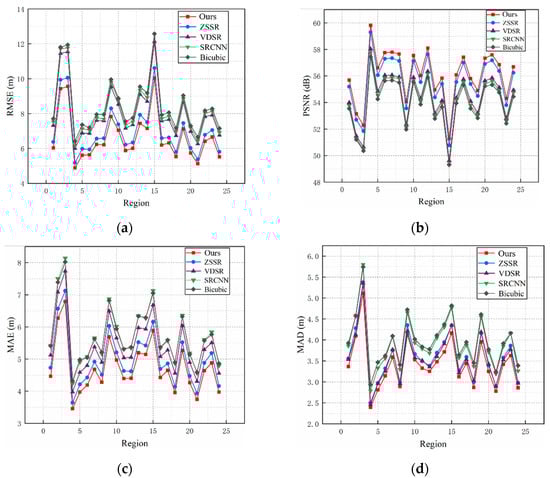 For the quantitative analysis, assuming that the DEM elevation error obeys normal distribution, the super-resolution reconstructed DEM can be measured by Root Mean Square Error (RMSE), Peak Signal-to-Noise Ratio (PSNR), Mean Absolute Error (MAE) and Median Absolute Deviation (MAD) []. The test dataset is selected from 24 DEM patches within the training area 31°N–32°N, 103°E–104°E. Super-resolution reconstructions are performed on the 24 DEM patches, and the RMSE, PSNR, MAE and MAD values are calculated for the results of the five DEM super-resolution reconstructions.