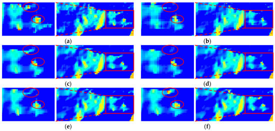 Detailed textures of the original DEM and the DEM after super-resolution reconstruction of the DEM using different methods: (a) The texture details of the original DEM; (b) The texture details of DEM after DEM super-resolution reconstruction using the bicubic method; (c) The texture details of DEM after DEM super-resolution reconstruction using SRCNN with external learning in deep learning; (d) The texture details of DEM after DEM super-resolution reconstruction using VDSR with external learning in deep learning; (e) The texture details of the DEM after DEM super-resolution reconstruction using internal learning-based ZSSR in deep learning; (f) The texture details of the DEM after DEM super-resolution reconstruction using our proposed new method of combined internal and external learning.