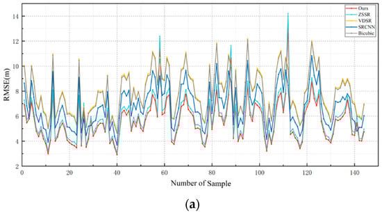 The test area is divided into 144 patches, and the average value of their RMSE results is shown in Table 5. Smaller values of RMSE indicate a better reconstruction effect, and Figure 11a is a visual representation of the RMSE values of the 144 DEM patches. As can be seen from the table, among the five DEM super-resolution reconstruction methods, our proposed DEM super-resolution reconstruction method based on a combination of internal and external learning has the smallest value of RMSE for the reconstruction result, with an improvement of 29.1% compared to the reconstruction result of the interpolation-based bicubic super-resolution reconstruction method. The reconstruction results are 17.7% and 30.0% better than those of SRCNN and VDSR, respectively, which are super-resolution reconstruction methods based on external learning in deep learning, and the results are 5.1% better than those of ZSSR, a super-resolution reconstruction method based on internal learning in deep learning.
