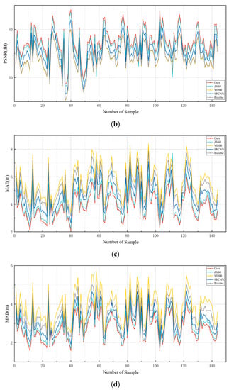 Quantitative results of different methods for the same region: (a) The visualization of the RMSE indicator; (b) The visualization of the PSNR indicator; (c) The visualization of the MAE indicator; (d) The visualization of the MAD indicator.