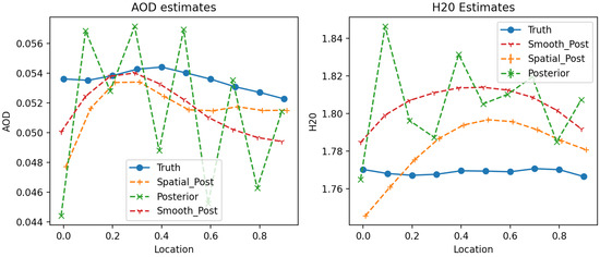 For post-hoc smoothing, there is an additional post-processing step in which the independent estimates for the atmospheric components are treated as noisy samples from a latent smooth field; the noise is assumed to follow the posterior variance as computed by the individual inversions. This post-processed smooth field is estimated by kriging and uses the true data-generating covariance as a prior, which is the best-case scenario and better than could be expected in reality.