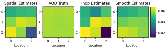 Inversions of simulated data showing the aerosol optical depth estimates across 9 pixels on a grid. The spatial prior is more accurate than the independent inversions and comparable to post-hoc smoothing.