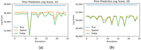 Figure 5a,b illustrate the prior score for the simulated realizations each of 1D and 2D pixel arrays. In most cases, the posterior is closer to the prior for the spatial case, resulting in a better prior score and implying that the spatial model better represents the data, as expected. For the 2D case, the difference is smaller, because of the greater inherent variability of a 2D field and the larger maximum distances between points.