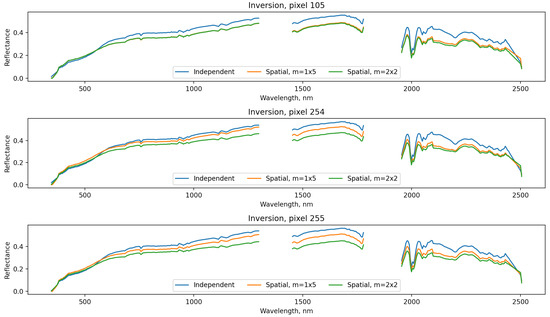 The next data set we explored was measured on 25 June 2014 at roughly 7:30 p.m. local time over Cuprite Hills in Nevada, USA. Here we have a swath of 50 × 150 pixels and perform individual, 1 × 5 pixel inversions, and 2 × 2 pixel inversions, with the spatial inversions using the same Matérn parameters (1.5, 0.75) as the previous data set. The choice of 1 × 5 and 2 × 2 pixels helps illustrate the difference between a 1-dimension, push-broom type of correlation versus a 2-dimensional correlation. We find very little difference in the surface reflectance across pixels shown in Figure 8. There is a mild scaling effect that occurs with the spatial versions, which we attribute to the different results for the atmospheric components, but the shape is consistently characteristic of soil with minerals. The results for atmospheric water vapor shown in Figure 9 show that the spatial models provide a smoothing effect that reduces the noisy estimates of the independent inversions. The aerosol optical thickness in Figure 10 has a similar story, where the spatial values tend to be lower and smoother than the independent inversion, which has stronger gradients between pixels. The fourth subfigure of Figure 10 shows reflectance for an arbitrary wavelength and suggests that the aerosols detected by all methods are influenced by the land reflectance, with the independent inversions more strongly influenced compared to the spatial methods.