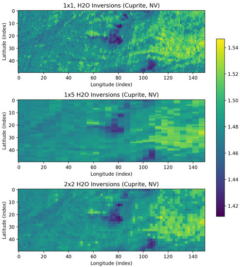 The forward model is a nonlinear function describing the processes of absorption and scattering of light by atmospheric gases, particulates and clouds, and reflection by an underlying surface, and is referred to as the radiative transfer model (RTM). The true physical model is complicated, so many simplifying assumptions are used, such as treating surfaces as Lambertian (isotropic) rather than describing them using a bidirectional reflectance distribution function. Since there are many parameters to the RTM, optimization over all possible combinations is infeasible. Instead, a look-up table of optical coefficients is calculated in advance. This table, indexed by the atmospheric state, allows a fast calculation of the forward model in each channel [12]. Typical LUT values for our work follow a coarse grid of AOD values of [0.01, 0.1, 0.33, 0.66, 1.0] across H2O vapor levels of [1.0, 1.5, 2] g/cm, solved at each grid point via DISORT. Emulation is an emerging and promising alternative to a coarse LUT [29,30], but not taken advantage of in this work. Sensor elevations vary from 3000 to 6000 feet above ground, with ground elevation ranging from 8 to 1500 feet above sea level. The viewing zenith angle is set to 0 and the solar azimuth set to 180 degrees. Wavelengths range from 350 to 2520 nm with the REPTRAN fine band parameterization. Standardized “mid latitude” atmospheres for winter or summer are applied to all data and simulations. For a full description of the forward model assumptions, we refer the reader to previous work [31].
