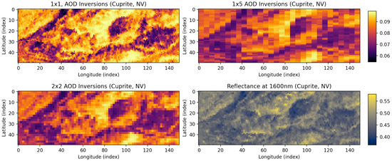 For the Cuprite dataset, the aerosol optical depth prediction is susceptible to the surface state prediction (bottom right), but smoothing with a spatial prior decreases the noise. The top left figure shows inversions done 1 pixel at a time, compared to stripes of 1 × 5 pixels in the top right figure and squares of 2 × 2 pixels in the bottom left figure. The bottom right figure shows topography visible at a single wavelength, 1600 nm.