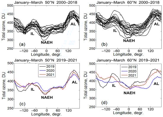 Zonal distributions of TOC along latitudes (a,c) 50°N and (b,d) 60°N averaged for January–March and their interannual variations in (a,b) 2000–2018 and (c,d) 2019, 2020 and 2021. Longitude 0° corresponds to Greenwich meridian, positive longitudes are east of the 0° meridian. AL is Aleutian Low, IL is Icelandic Low and NAEH is North Atlantic–European High.