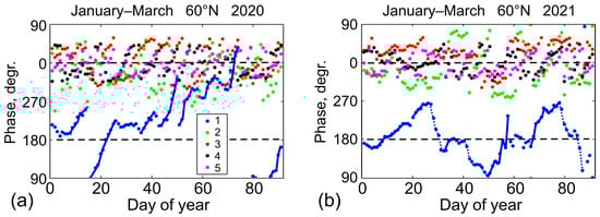 Daily variations in phases of the Fourier spectral components with zonal wave numbers m = 1–5 at a latitude 60°N in January–March (a) 2020 and (b) 2021.