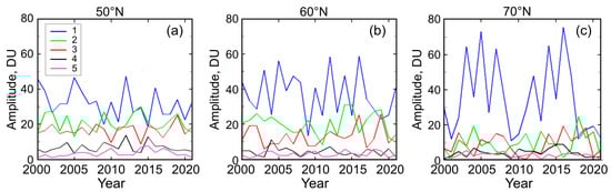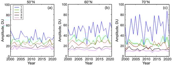 Interannual variations of amplitudes of spectral wave components with m = 1–5 in 2000–2021, averaged over January–March. The latitudes (a) 50°N, (b) 60°N and (c) 70°N are presented.