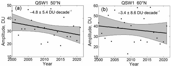 No significant trends were identified at 70°N, as well as in the amplitudes of QSW2 or total wave, at all latitudes studied (they are mainly close to zero; not shown). The QSW1 amplitude trend of −4.8 DU per decade at 50°N (Figure 7a) means amplitude decrease by ~10 DU during 21 annual intervals (2000–2021), or by 33% relative to mean level (32 DU). The observed decrease in QSW1 amplitude leads to its approach to the QSW2 amplitude at the end of the study period, since the latter does not undergo significant changes.