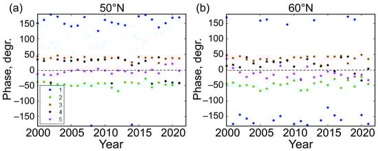 Interannual variations of phases of quasi-stationary spectral components with zonal wave numbers m = 1–5 in 2000–2021, averaged over January–March, at (a) 50°N and (b) 60°N.