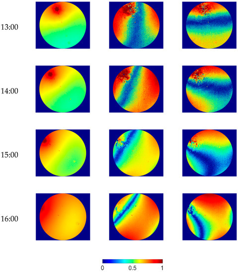 From the image of the polarization angle in a clear sky, it can be observed that the concentration point of the polarization angle is the position of the atmospheric polarization’s neutral point. The position and shape of the polarization angle’s distribution are different with different solar height angles. It can be found that with the change in the position of the sun, the convergence point of the polarization angle of the whole sky revolves around the zenith. When the solar altitude angle is high, we can only observe one convergence point of the sky polarization angle, and we can only see one convergence point for most of the day. Only when the solar altitude angle is low, such as the image at about 16:00 p.m., can we observe another convergence point.