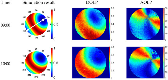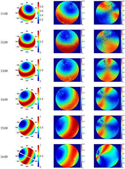 Figure 4 shows the simulation results of the DOLP based on the Rayleigh scattering model and the observation results of the DOLP and the AOLP obtained from the experiment. When using a Rayleigh scattering model to simulate the degree of polarization distribution, we calculate the solar altitude and azimuth at each time. A specific geometry between the sun and the detector is formed by the relative positional relationship between each point in the sky and the sun. It is used to calculate the polarization information of each point in the sky. The maximum zenith angle in the Rayleigh model is 60 degrees because the field angle of the fisheye camera is about 120 degrees. For the distribution of the degree of polarization, the simulation results are almost the same as the actual results, because the experimental conditions are ideal, sunny, and the air scattering was mainly Rayleigh scattering. The Rayleigh model can accurately represent the degree of polarization distribution on sunny days, which proves the accuracy of the sun position calculation method and the degree of polarization calculation method. It can be seen from the experimental results that the degree of linear polarization in the whole sky decreases with the increase in the solar altitude angle, and the position of the atmospheric neutral point is related to the position of the sun. The linear degree of polarization presents an obvious circular distribution, which is often called the halo phenomenon.