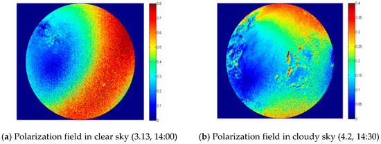 In cloudy weather, the clouds cut off the complete polarization ring; however, the change trend of polarization can still be seen, and the neutral point area of the atmosphere in the sky is still obvious. On sunny days, the value of sky polarization is large, and the circular distribution is relatively complete; in cloudy conditions, the value of sky polarization is small, and the circular distribution is irregular.