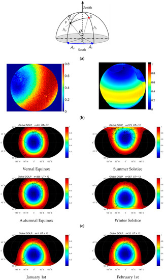 The phenomenon of sky polarization is first found in the ground-based sky observations. Figure 6a shows the observation geometry of the ground-based sky observation, where s represents the sun, OP represents the direction of observation in the sky, and Z represents the zenith. By changing the directions of OP, the polarization distribution of the whole local sky can be observed. The team has made ground observations in Finland, Hungary, Beijing, Zhuhai, and other places in China. These local observations are highly consistent with the model simulation. Nathan J. Pust and Joseph A. Shawhave conducted ground observation in the United States [9], as shown in Figure 6b. The degree of polarization of the atmosphere changes with the position of the sun. Taking the observation point as the origin, when the angle between the observation direction and the sun is 90°, the degree of the polarization reaches the maximum and then gradually reduces to 0° at the mirror point of the incident light. Based on this, we simulated the global atmospheric polarization distribution under the condition of the vertical upward observation of the ground (see the detailed simulation process in the Supplementary Materials), and the results are shown in Figure 6c. The polarization pattern map in the sky is closely related to the solar altitude angle. The degree of polarization varies with the solar altitude angles, and the intensity and direction of the polarized light are different. When the solar altitude angle is low, the polarization intensity ratio in the sky is larger; in other words, the polarization intensity in the sky is larger in the evening or in the morning than at noon. The polarization also varies by season: the spring equinox, summer solstice, autumn equinox, and winter solstice generate regular changes in their distribution.