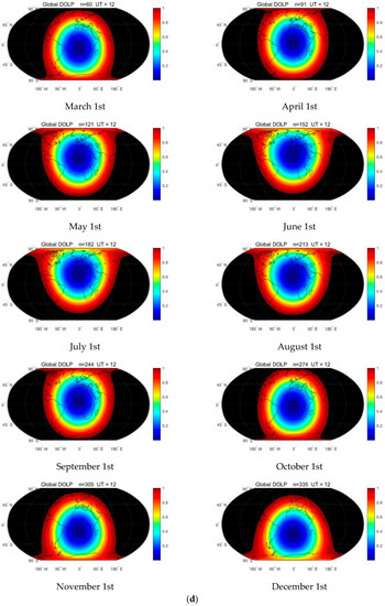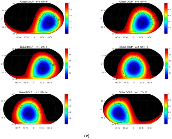 Figure 6d shows the annual variation in the global skylight polarization field. The theoretical distribution of the global skylight polarization was calculated at 12:00 GMT on the first day of each month. The point with the lowest degree of polarization is theoretically the subsolar point, which moves between the Tropic of Cancer and the Tropic of Capricorn. The cycle of long-term variation is one year. Moreover, Figure 6e shows the diurnal variation in the global skylight polarization field. The theoretical distribution of the global skylight polarization was calculated at six time points on the day of the summer solstice. The point with the lowest degree of polarization changes with the alternation between day and night during a day and with the movement of the sun’s position in the day hemisphere. The cycle of short-period variation is one day.