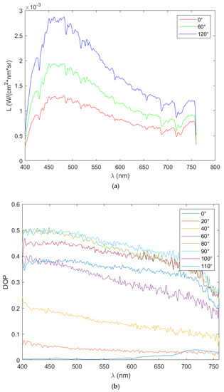 Figure 7b is the observation result of the spectral DOLP from the sun to the east at an interval of 5 degrees. It can be seen that the spectral DOLP gradually increases from the minimum value from facing the sun to 90 degrees away from the sun. Furthermore, it increases fastest when it is between 20–80 degrees. It can also be observed that the degree of polarization changes significantly in the range of 400–600 nm. The best wave bands for observation by degree of polarization are 390–455 nm in violet, 455–492 nm in blue, and 492–577 nm in green.