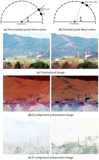 (a) The observation geometry of the non-field-axis area. (b) The observation geometry of the field-axis area. The imaging device used in the experiment was a polarization spectrum camera. (c) The unpolarized image of the field-axis area and the non-field-axis area has high atmospheric visibility. The image is clear whether it is observed in the neutral-point area or the non-neutral-point area. (d–e) are the Q component and U component images of (c). (f) The DOLP image, which takes (c–e) as the red (R), green (G), and blue (B) bands, respectively.