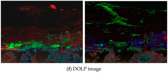 In Figure 8, the white area indicates that the DOLP is large, whereas the black area indicates that the DOLP is small. In the polarized image observed, the neutral points (right column) are clearly visible, whether for the nearby Foshan Pavilion at Wanshou Mountain in the Summer Palace (linear distance from the shooting point is about 3.1 km) or the western mountain (linear distance from the shooting point is about 6–8 km). The bare soil (or road) information on the mountain is in strong agreement with the unpolarized image. The polarized information revealed from the images of three different bands of red, green, and blue is also different. In the polarized image of the non-neutral point (left column), the information of the nearby features has a good performance (as seen in the Buddha Xiangge), but the information of the distant mountains is much weaker and is vague. However, only an outline of the mountain appears. This means that the polarized information of distant mountains cannot be effectively obtained when observing through non-neutral points. It also shows that the distance between the observing point and the objects increases, the atmospheric polarization effect increases, and the polarization information of the object decreases. Therefore, the atmospheric effect of non-neutral point observations is stronger than that of neutral point observations. The DOLP images observed through the axis of the polarization field have better contrast when regarding distant objects. The amount of information about the features on the polarization image (right column) observed through the neutral point is much larger than that through the non-neutral point, especially for distant objects.
