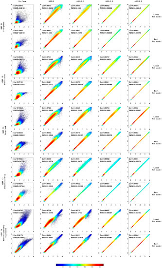 Figure 9 shows the effect of different BPDF (Bidirectional Polarization Distribution Function) models on TOA (Top of Atmosphere) polarized reflectance under different aerosol optical depth conditions. The first column is the comparison between the simulated and observed surface polarized reflectance. The second column is the comparison between the modeled and the observed TOA polarized reflectance under Rayleigh conditions. The last three columns are the comparison between the modeled and the observed TOA polarized reflectance under different aerosol optical depths ranging from 0.1 to 0.5. The correlation coefficient and RMSE × 100 are displayed in the upper left corner of each sub-figure.