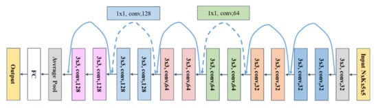 In Figure 4, each residual block contains BN, Relu, and weight layers. The BN layer permits a higher learning rate, markedly enhances the speed of training, and, in particular, prevents gradient vanishing or divergence. To train LSM-ResNet, a Relu activation function neural network is used. Weight layers perform the convolution operation. Furthermore, the solid line and the dashed line correspond to two different residual blocks. In the solid line, the block is the same as the number of channels in the previous connection layer, and the residual calculation is directly executed.