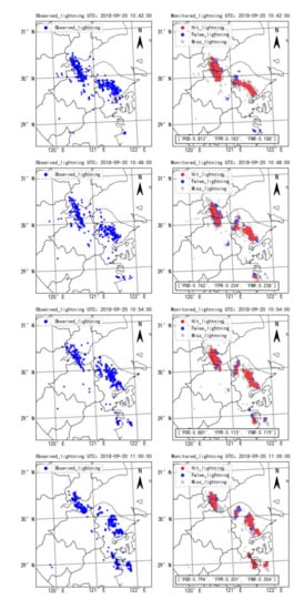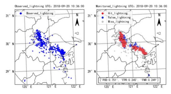 To further verify the LM-ResNet model, we used a period of lightning observation data to perform a comparison with the monitored lightning location results. The China Meteorological Service Centre issued thunderstorm warnings on 20 September 2018. Affected by drastic convective cloud clusters, violent lightning activity occurred in Ningbo. Radar products around lightning can represent the evidence of lightning instance activity, and land attribute data have an influence on lightning occurrence. We selected radar data (PPI, CR, ET, VIL, and V) and corresponding land attribute data (DEM, slope, aspect, land use, and NDVI) from 10:36 to 11:06 for monitoring. Under normal circumstances, lightning is not very stable, and there is some drift during the discharge process. According to previous studies [45], it is believed that the lightning location within 1 km around the monitor is efficient. POD, FPR, and FNR were utilized to analyze the model results.