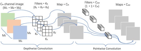 Depthwise separable convolution (DSC) is one of the two types of detachable convolution [56], which not only deals with the spatial dimension, but also with the depth dimension (the number of channels). Therefore, more attributes extracted, more parameters can be reduced. DSC is a more common method in deep learning, which consists of two steps, the first step is depthwise convolution, which convolutes the input image without changing the depth. The second step is pointwise convolution, increasing the number of channels in each image, and using the kernel function to enlarge the depth. Essentially, deep detachable convolution is the decomposition of 3D convolution kernels (decomposition on deep channel). Compared with standard 2D convolution, deep detachable convolution requires less computational effort only accounting for of that of 2D convolution [57]. The detachable convolution has fewer kernel moves, reduces the number of parameters required in the convolution, and reduces the amount of computation, enabling the network to process more data in a shorter time. lt can improve efficiency under the right circumstances, and can significantly improve efficiency without sacrificing model performance, which makes it a very popular choice [58].