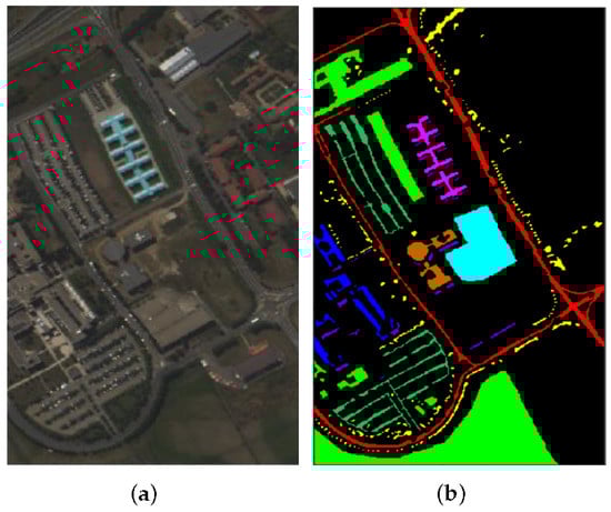 The University of Pavia (UP) dataset [63] refers to a hyperspectral image taken in 2001 of the University campuses in Pavia, Italy, by an ROSIS sensor, containing 9 features. The spatial resolution is m, the size is pixels, and the spectral band range is ∼m. The original dataset consists of 115 spectral bands, after pre-processing, 103 valid bands are retained for effective classification experiments. Figure 6a represents the RGB false color image of the dataset, and Figure 6b represents the distribution of the real ground objects. Similarly, Table 2 gives the 9 categories and sample size of objects, the sample size is abundant compared with that of the IP dataset. However, the sample size of each category is not balance either, which requires the classification model with strong generalization ability.