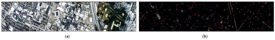 The University of Houston (UH) dataset [64] was acquired by the ITRES CASI-1500 sensor in 2012. The spatial size is , and its spatial resolution is achieved at m. There are 144 bands in the spectrum of 380∼1050 nm, covering 15 categories feature types. The category with the most pixels is stressed grass, with 1254 pixels. The smallest class is the water with 325 pixels. Their categories and sample size are shown in Table 3. Spatial resolution was achieved at m. Figure 7a refers to the RGB false color image and Figure 7b is the corresponding ground truth value of the dataset.