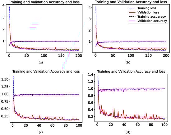 Training loss, validation loss, training accuracy and validation accuracy (learn curves) of two HRSI datasets. (a) 3DCNN of the IP dataset, (b) 3DCNN-AM of the IP dataset, (c) 3DCNN of the UP dataset, and (d) 3DCNN-AM of the UP dataset.