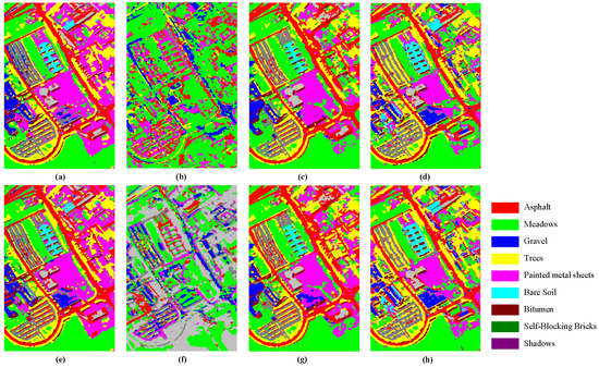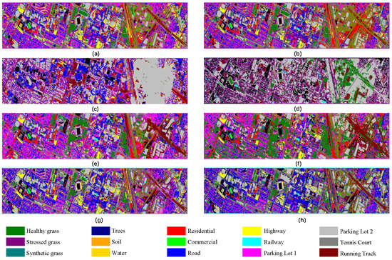 Classification maps of UH dataset. (a) 3DCNN (b) 3DCNN-AM (c) 3DCNN-AE (d) 3DCNN-AM-AE (e) 3DCNN-PCA (f) 3DCNN-AM-PCA (g) 3DCNN-DSC (h) 3DCNN-AM-DSC.