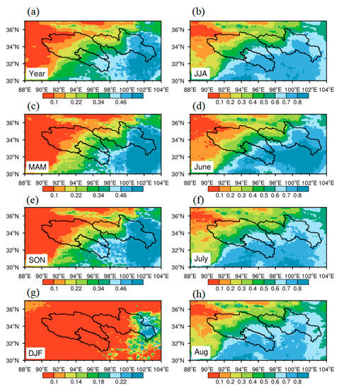 In terms of precipitation occurrence ratio (i.e., proportion of precipitation days in the total days, Figure 4), the distribution characteristics for multi-year climatology, MAM, JJA and SON consistently decline from southeast to northwest, the same as precipitation amount shown in Figure 2. There is not much distinction between MAM and SON. However, for JJA, precipitation days occupy more than 60%, particularly in June, almost 80% of the days have precipitation events, followed by July and August. In the west of the SRTR, precipitation is suppressed most of the time. However, for the east part of the source region of the Yellow River, it always presents a relatively higher frequency of precipitation in all seasons, which has also become an important water supply area for the Yellow River. In DJF, precipitation only occurs in this region, suggesting a very dry condition in other regions of the SRTR.