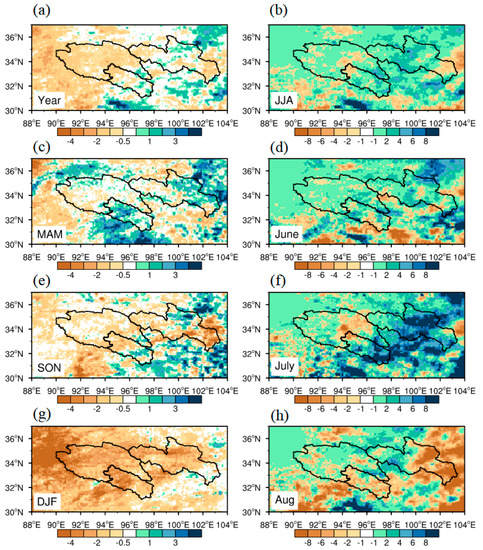 Figure 5 shows differences between the climatology of precipitation in the two decades, i.e., 2010 to 2019 and 2001 to 2010. For the annual average precipitation, it shows a slight decrease in the north and west of the SRTR and a slight increase in the eastern and southern parts. In a large area of central SRTR, precipitation shows tiny variation. The most significant changes happened in the southeast of the source region of the Yellow River and the Lantsang River. Considering the contribution of different seasons, MAM, SON and DJF dominate the decreasing of precipitation in most area of the SRTR, while JJA contributes the most increases. Precipitation in spring presents a similar pattern, with the annual average, while in SON, precipitation in most of the area shows a drying trend except the southeast of the source region of the Yellow and Lanstang Rivers. The winter presents a total drying pattern in contrast with the total wetting variation in most areas in summer. For different months in summer, precipitation shows a significant increase in June, especially in the center to the south, while it has an increase in the north in August. In July, it shows basically a drying trend in the northwest of the SRTR and a wetting trend in the south.