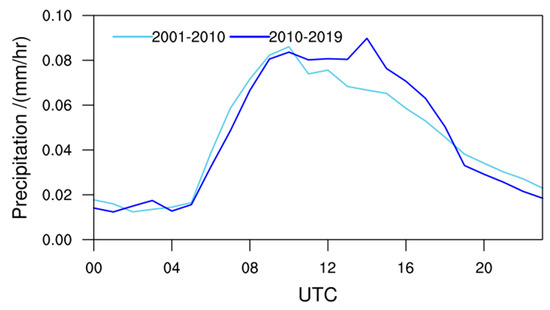 As shown in Figure 8, the nighttime precipitation changes show similar patterns as in Figure 5, except the magnitude in the night is different. The spatial correlation coefficients are around 0.9 for almost all time periods (Table 2), suggesting a dominant contribution of nighttime precipitation to the total precipitation changes. Figure 9 shows diurnal changes in precipitation rates between the two decades. In the morning in the local time (i.e., 00:00 to 04:00 UTC), there are no significant changes between the two decades. For afternoon precipitation (04:00 UTC to 12:00 UTC), there is a slight reduction in the 2010s in contrast with the 2000s, whilst there is a strong increase shown for the nighttime precipitation, emphasizing the contribution of nighttime precipitation variation to the total precipitation.